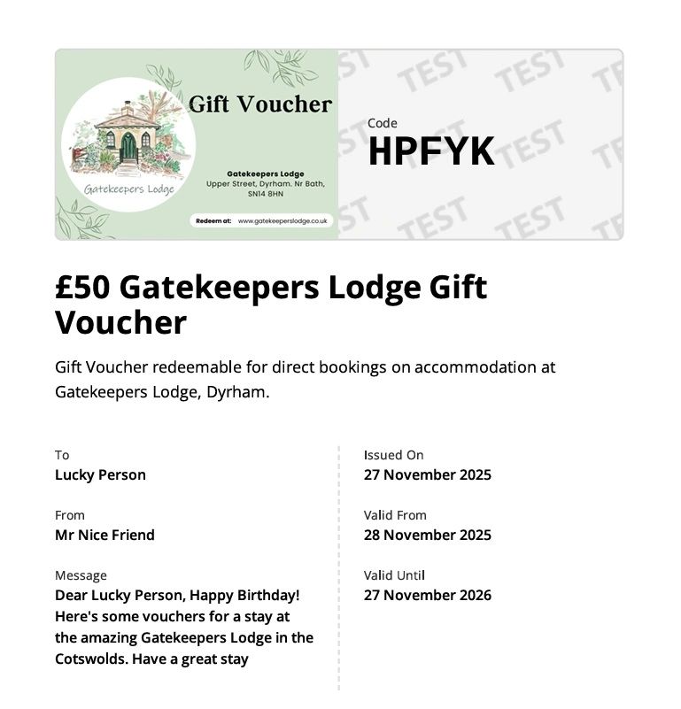 Share your love for travel with a gift card from Gatekeepers Lodge, Self Contained Cotswolds Holiday Cottage at Dyrham Park nr Bath & Bristol. Perfect for birthdays, anniversaries, or just because!